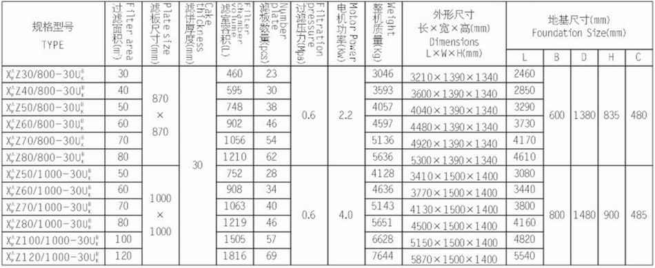 | 節(jié)能、高效全自動廂式壓濾機 一.結構特點: 節(jié)能、高效全自動廂式壓濾機是一種間歇性加壓過濾設備,采用積木式結構,各部件結構設計合理,聯結簡單,適用于不同用戶的需求。整機具有自動化程度高、生產能力大、單位產量高、過濾速度快、濾餅含水率低等特點。節(jié)能、高效全自動廂式壓濾機采用機、電、液一體化設計制造,能夠實現自動壓緊、壓濾、洗滌、反吹、吹脫、松開、拉板、取板、沖洗等過程,由電氣柜控制,按PLC可編程邏輯控制器設定的程序進行。 二.部件介紹 2.1 機架部分 機架部分主要由機座、壓緊板、止推板、主梁等組成。 我公司自主研發(fā)生產的“鑫濾”牌壓濾機機架。其中壓緊板、止推板、油缸座均采用Q345B鋼板,經二氧化碳氣體保護焊焊接而成。主梁設計為矩形鋼結構,材質為Q345B鋼板,經自動埋弧焊、二氧化碳氣體保護焊雙面焊接而成。整機各部件焊接后均經高溫退火定型處理,用高速氣流拋丸機噴砂除銹,不僅把表面的銹及氧化層除掉,并在其表面打出細小麻窩,使油漆附著力更強,不易脫落。再噴涂防銹底漆,最后整機噴涂環(huán)氧樹脂漆防腐處理。具有整體性能穩(wěn)定,耐腐蝕、硬度高、抗拉強度大、承載壓力高,抗沖擊性能強、外形美觀等優(yōu)點,可確保設備使用安全、穩(wěn)定。 2.2 液壓部分 液壓系統(tǒng)主要由液壓站、液壓油缸、壓力表、閥件等構成。 液壓站由我公司自行設計加工,整個過程均在無塵恒溫車間裝配完成。液壓系統(tǒng)為集成塊式設計,配合電氣控制系統(tǒng)順序完成油缸的自動壓緊、自動補壓、自動松開、前進、后退、到位自停等基本動作。提高了整個液壓系統(tǒng)的安全性、可靠性,同時便于維修與保養(yǎng)。 液壓站的油箱焊接完成后對內壁進行噴砂、酸洗、磷化等工藝進行防銹處理,對外壁進行防靜電噴涂處理。集成塊使用數控鉆床進行加工,各孔之間的形位公差可以完全達到圖紙要求,同時使用超聲波清理鐵屑等雜質,再用煤油進行清洗,確保油液不受二次污染,保證液壓系統(tǒng)正常工作。 液壓油泵采用江蘇恒源變量泵,空行程時大流量,可以縮短油缸空行程時間,增加循環(huán)次數,提高工作效率;升高壓時流量自動減小,這樣節(jié)省了電機功率,降低了消耗,節(jié)省了能源。 液壓主控閥件選用北京華德產品,各項性能指標,具有操作方便、運行靈活、安全可靠等特點。普通壓力表及電接點壓力表選用中國紅旗品牌,具有精度高、防振好、使用壽命長等優(yōu)點。 我公司液壓液油缸有效的防止出現的爆缸事件,由此產生的安全事故。油缸的材質為27SiMn無縫鋼管,經進口鏜床粗鏜、精鏜、滾壓而成。全部精度達到IT8級,同時缸內壁硬度大大提高,其耐磨性及密封性良好。最高工作壓力可以達到25MPa,可以完全滿足壓濾機濾板密封要求,并且使用安全可靠,安裝維修方便。 活塞桿經車削、磨削加工,并進行調質處理后外鍍0.06mm硬鉻,后經精磨而成?;钊麠U材質為45號鋼,外部加有伸縮保護套,具有硬度高、耐磨性能好、使用壽命長等優(yōu)點。 密封圈采用進口的四氟銅材質加工而成,可正常運行五年不更換,能有效的保證油缸密封性和靈活性。 2.3 過濾部分 濾板是壓濾機的核心部分,主要由濾板、水嘴、手柄等組成。濾板在設計方面,通過合理的濾點排布、過濾面支撐點排布、流道設計、排液孔開孔角度等綜合性設計。使濾板在過濾過程中進水流速快、對濾板沖擊小、濾料分布均勻、提高了過濾速度、增強了洗滌效果、延長了濾板使用壽命。 2.4 自動拉板部分 自動拉板系統(tǒng)主要由拉板變頻電機、拉板器、鏈輪、鏈條、鏈槽、防護罩等組成,它的主要作用就是當過濾完成以后逐塊拉開濾板實現自動卸除濾餅。我公司生產的鏈盒為密閉式結構,可以防止卸餅過程中殘渣掉入拉板器,保證了拉板系統(tǒng)的清潔性和靈活性,從而可確保在惡劣環(huán)境下順利完成卸餅工作。拉板電機為低能耗小功率變頻調整電機,節(jié)能環(huán)保。通過減速電機提高傳動扭矩。變頻電機的調整范圍廣,可在0Hz-50Hz之間任意調節(jié)。變頻器選用進口產品,具有抗干擾、抗電流沖擊、節(jié)能環(huán)保等特點。采取多段速運行,以低速測速、調整取板、低速減速、過載檢出、智能運算的過程來實現人性化拉板。該產品性能優(yōu)異、在運行中可自動檢測電機的電流及運行速度。 2.5 控制和檢測部分 變頻器選用瑞士ABB公司產品,PLC可編程邏輯控制器選用德國西門子公司產品,電氣元件選用法國施耐德產品??烧_\行數萬次無故障。PLC預留DCS遠程集散接口,可實現遠程監(jiān)視各項操作。電氣的設計原理上采用隔離變壓器電源保護,抗電流沖擊和電壓波動,用隔離輸出提高控制點的載流量,有效的保護PLC,同時也提高PLC使用壽命,又便于安裝維修。 參數表 ![]() |
